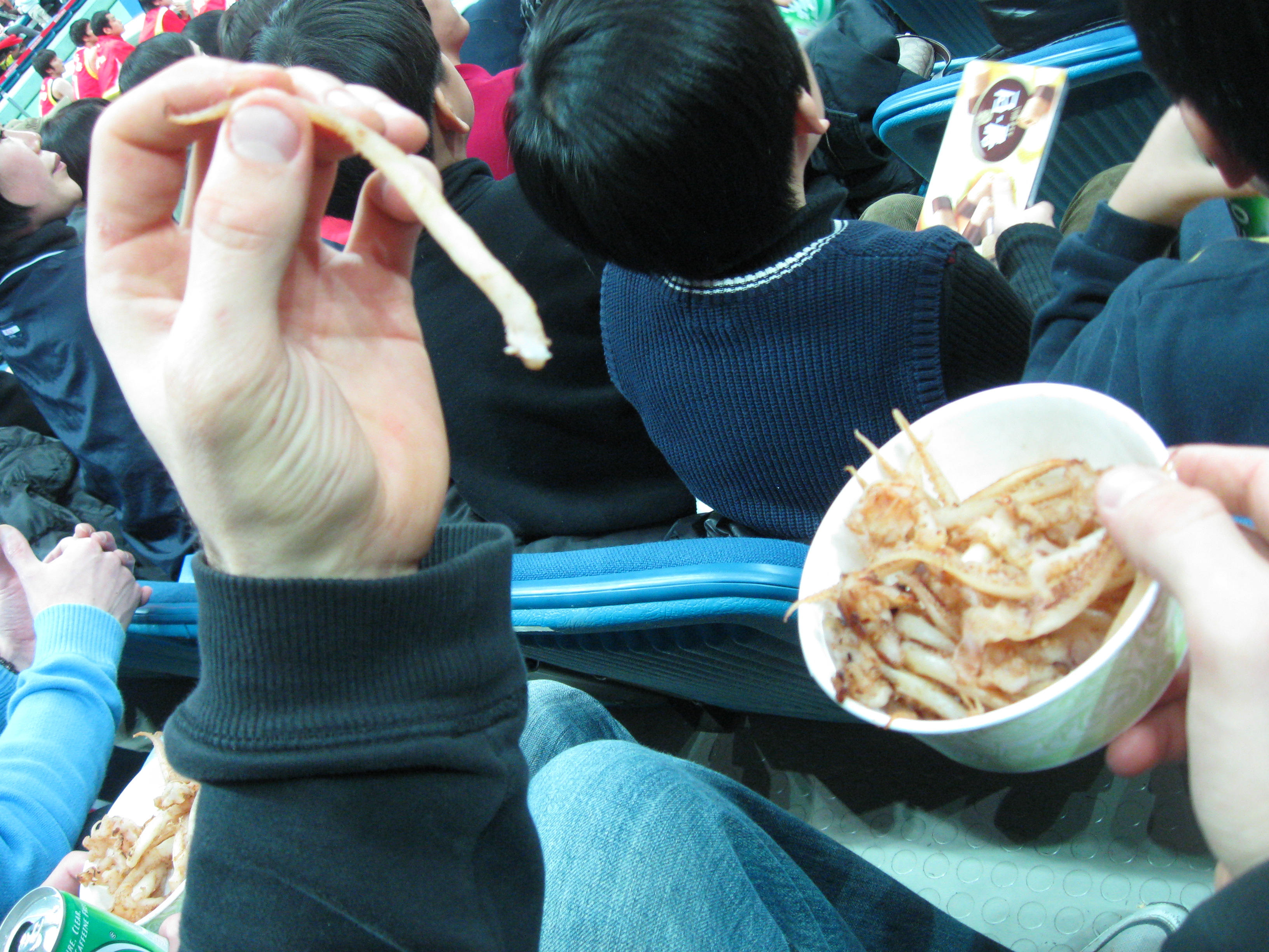No sporting event would be complete without game food. While soda pop and chips are available, the favorite grub of the game goers is, hands down, fried squid legs served in a similar fashion as french fries in a bucket with optional ketchup. Audience members can also snack on fish on a stick or insect larvae. During at least two points every game, free pizza or doughnuts are handed out by cheerleaders to the audience members making the most noise. We witnessed a Korean mother wrestling a young boy to the ground during Monday’s game in order to get her hands on some free snacks. Items given out or auctioned to fans who stick around after the match may include: Toilet paper, razors, cleaning products or a Hyundai sedan.