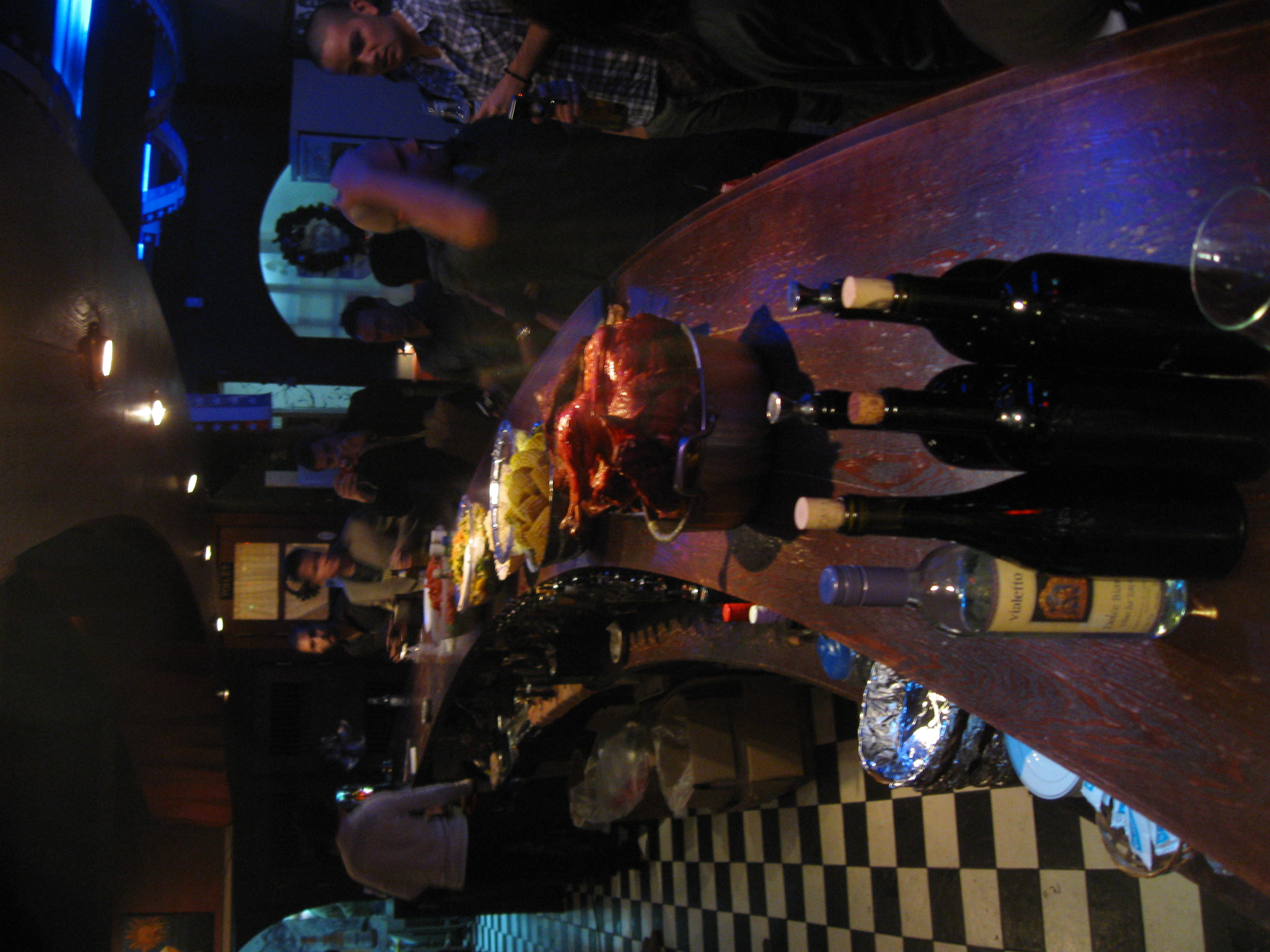 Friday night Matt and I sat on our Ondol heated floor peeling potatoes, crumbling bread for the stuffing and wondering why we had thought this would be a good idea. With all the prep work done for our meal I left for my after school teaching job and put the execution in Matt’s hands….and he did a fantastic job! Our apartment was filled with the smell of garlic, butter, french bread and wine when I arrived home a mere twenty minutes before guests arrived. We had solicited the assistance from our lovely neighbors for the use of an extra burner, and when guests showed up we had successfully set our harvest table with: Two game hens, garlic mashed potatoes, apple and wild mushroom stuffing and chicken gravy, all ingredients found in the outdoor market and all delicious.