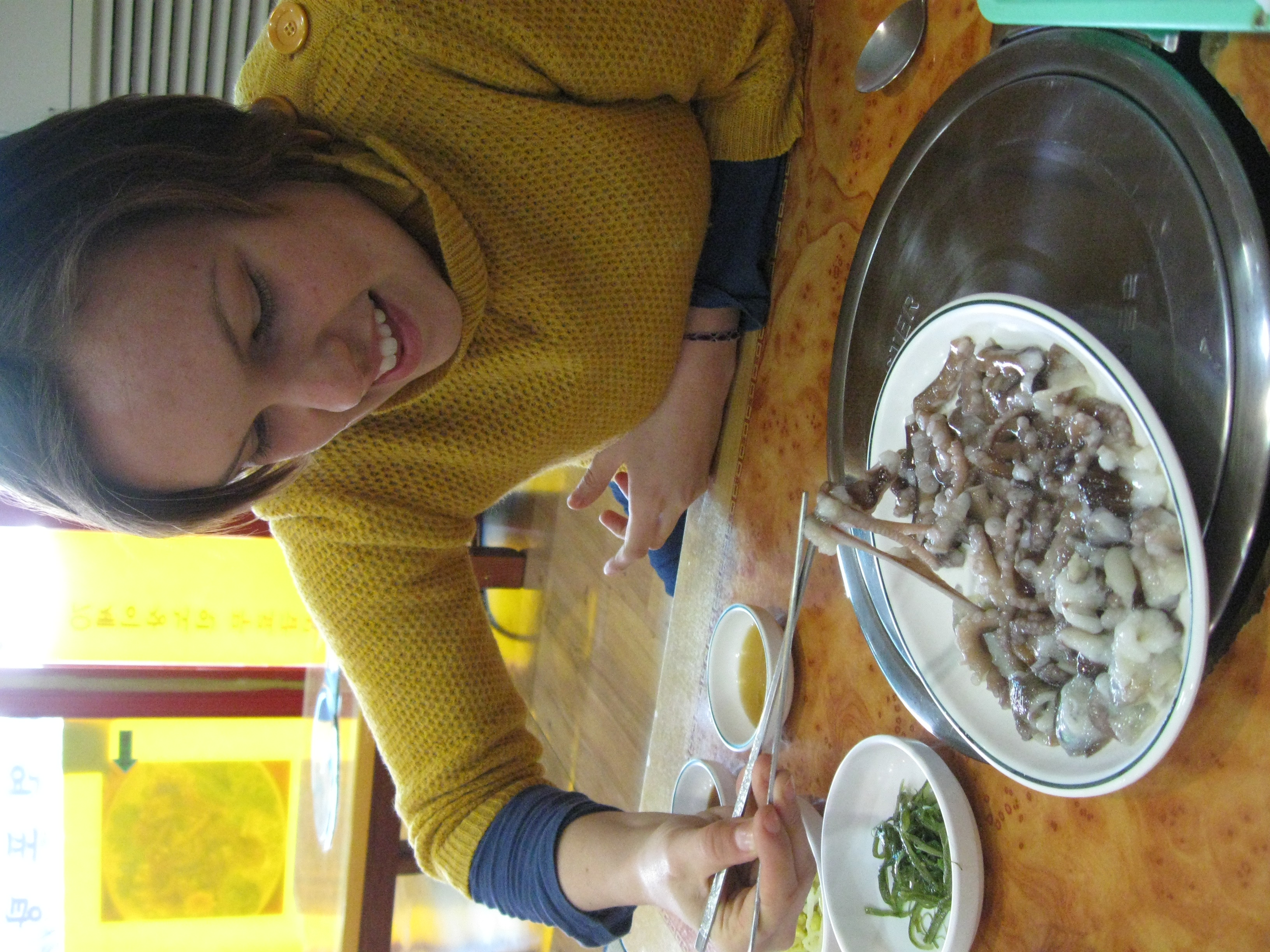 Last night Matt and I went in search of this live octopus we’ve been hearing of with brave stomachs and supressed gag reflexes. When we go searching for something it usually ends in fits of laughter as we try to convey what we are looking for in our broken Korean. Like last week when we went looking for the dinosaur tracks that apparently dot the northern bank of the river. We walked up to a farmhouse, clad in our scooter helmets and goggles asking for the “Gong-ryup” (Dinosaur). We knew just what we were doing, and revelled in the astonished look of the farm keeper as she replied “Op-sio” (We don’t have). hehehe. This time we were certain to be pointed in the direction of the octopus.