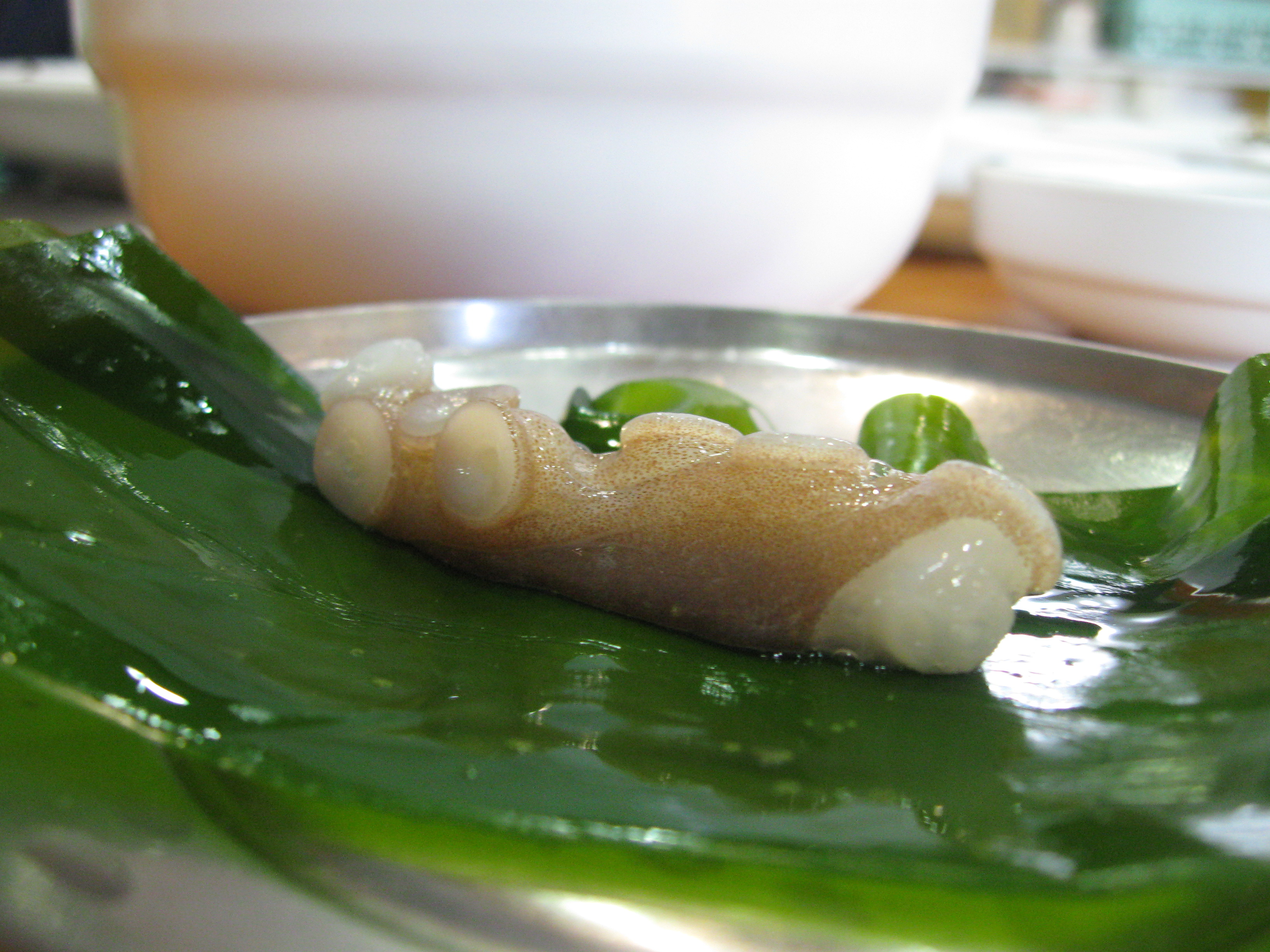 Outside of the delicious in every culture’s cuisine lies the exotic. While neither of us have sampled dog meat here in Korea we have done our fair share of exercising our taste buds to new flavors. We went to a fusion restaurant the other night, a tiny five table joint in our neighborhood with a chalkboard menu containing three items: Kal-guk-su, Bap and Shabu-shabu. Shabu shabu is a Japanese dish where thinly sliced beef is swished very quickly in a bubbling soup being cooked in the center of the table. The few second swim is enough to cook the beef just enough to eat or, can be sampled raw with wasabi. Raw is a big theme since we have been here. This was expected and welcome since we are both big sashimi fans and indulge in creatures of the sea whenever possible. What was not expected was the consumption of sea creatures that are still alive. Live octopus: San-nak-ji is a common dish here and is something that we had to try.